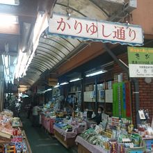 こんな短い通りでもしっかり名前があります。ビルの下のような短い露店のようなお店の前を通り過ぎると更なるカオスが待っています。むつみ橋通りやえびす通りと言った地元感満載の商店街と比べても引けの取らないローカル感です。店頭に置かれた台に見慣れないお菓子屋や調味料が並んでいます。