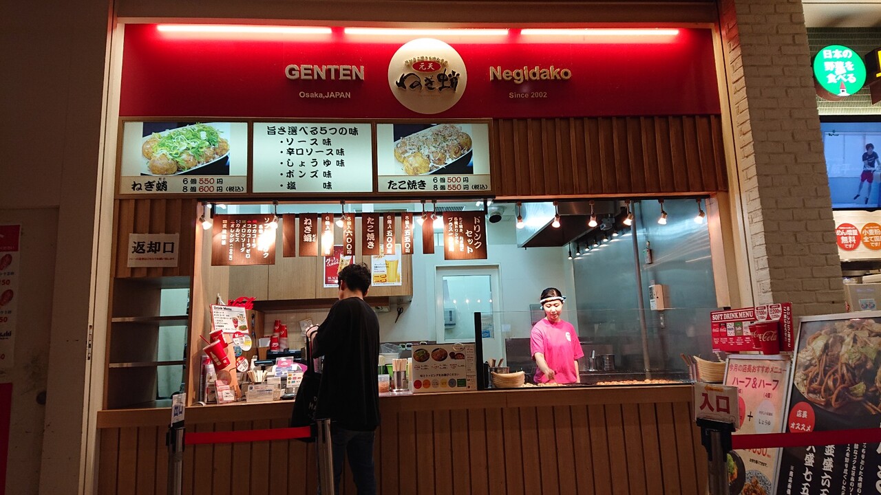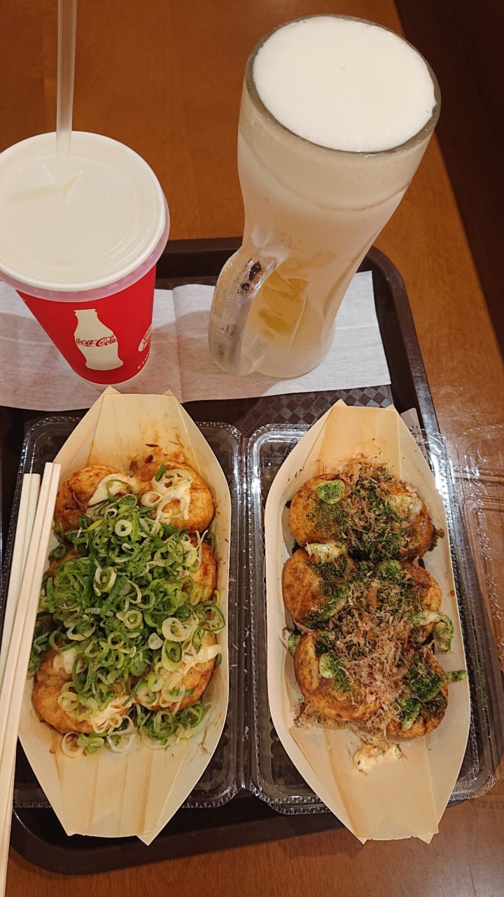タコ焼とネギタコを2箱とドリンク2つで¥1,110と格安。ビールにすると¥1,350~。ネギタコ美味しい。