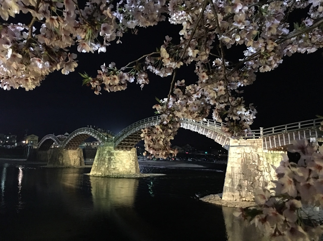 八重桜が多いからか、まだ桜が残ってくれていました。ライトアップされた錦帯橋と桜の競演は見事でした。