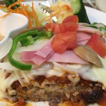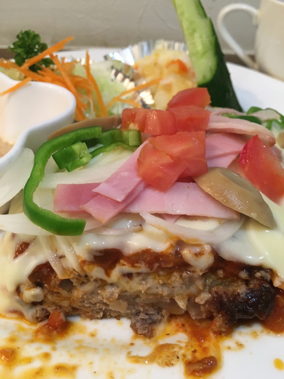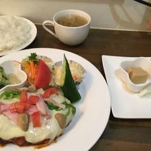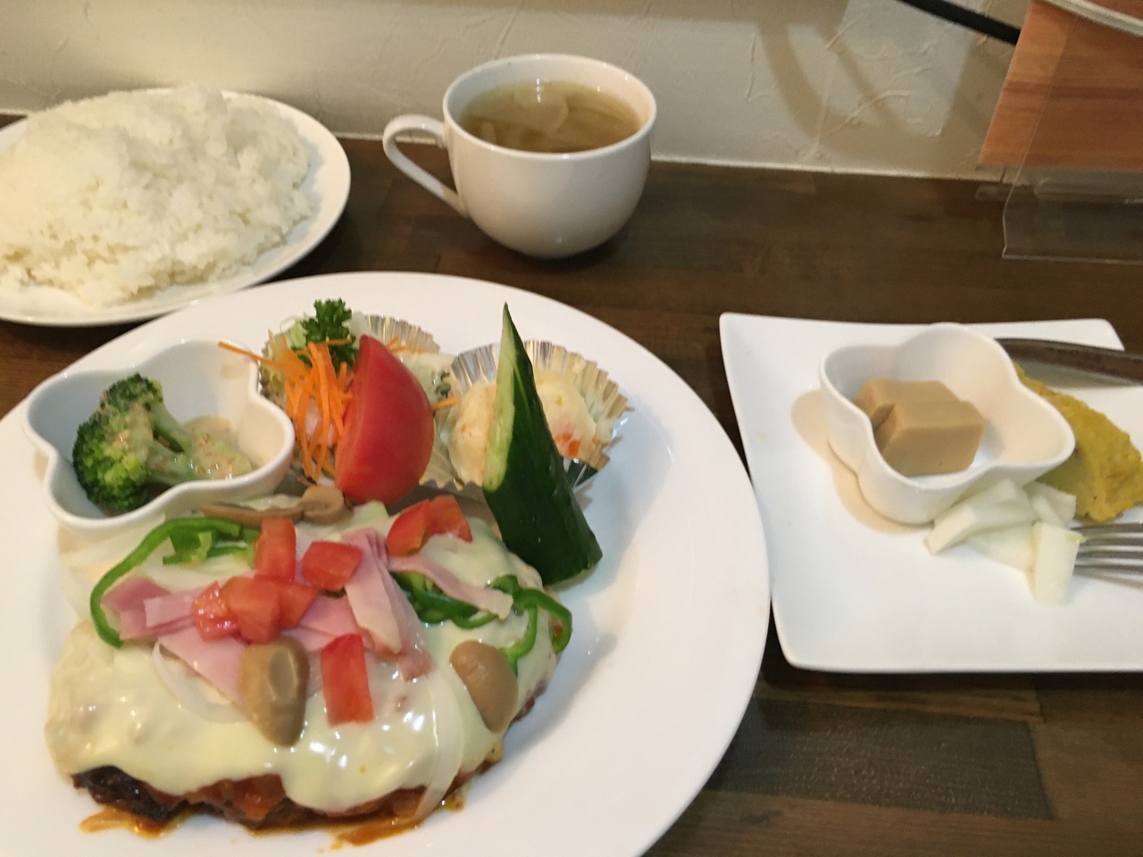 カウンター7人ぐらい座れ、テーブル席一つの小さな店。弁当の持ち帰りもやっているようでしたが店内でハンバーグを食べました。ハンバーグ4種あり、イタリアンを食べました。トマトソースベースでハンバーグにチーズがのっていてべコーン、トマト、ピーマン当時がのっていてボリューム満点。サラダ、スープも付き満足の味でした。
