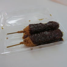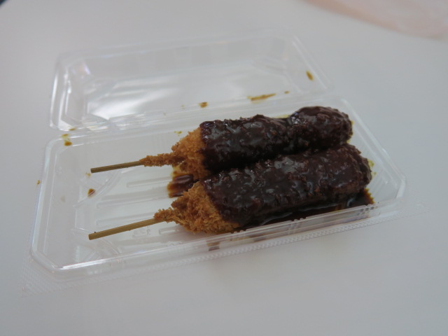 どう考えてもB級グルメで、特別美味しい・・・いやどちらかというとマ・・・レベルなのですが、手軽につまみ食い感覚なので、ウズラ串と豚串を購入してしまいました。