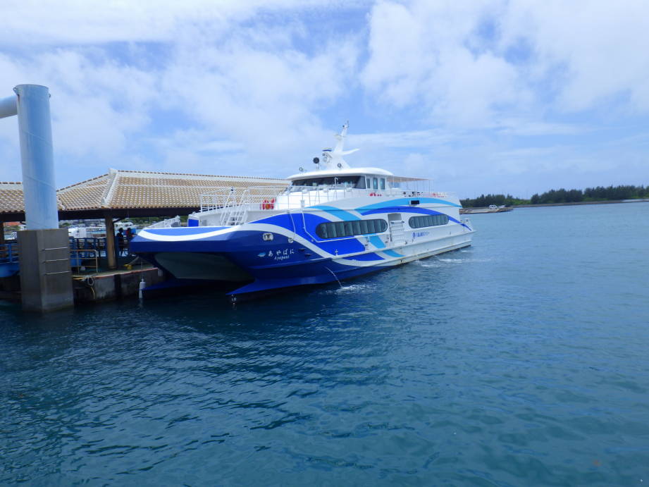 石垣島から竹富島へ行くのに安栄観光でチケットを買ったのですが、乗った船は往復とも八重山観光のものでした。両者は共同運行していてどちらにも乗れるので便利でした。八重山観光の船はサザン〜というカタカナの名前がついていて海上をモーターボートのようにかっ飛ばすので爽快でした。