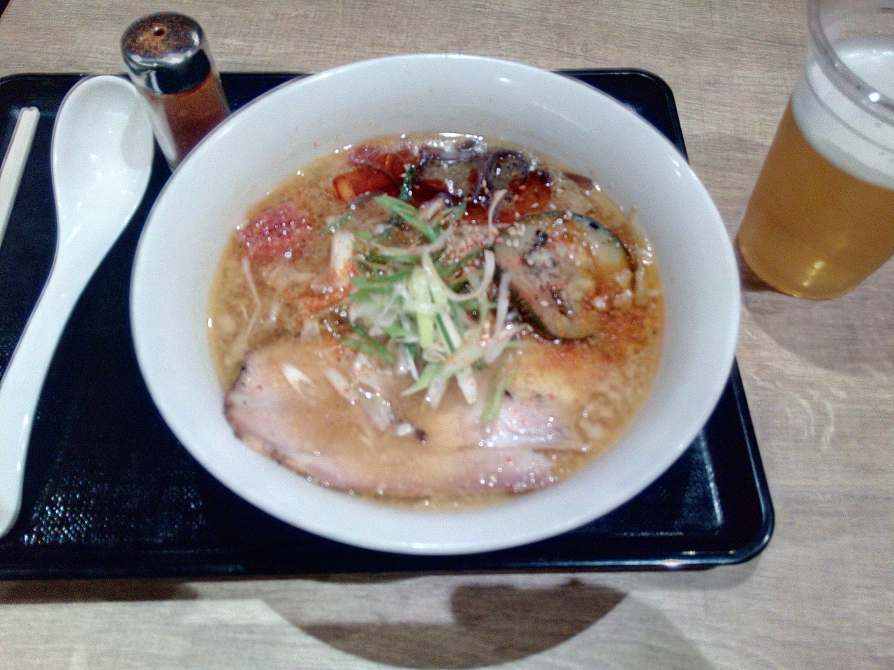 新千歳空港の出発ロピーにある、小さなフードコート内にあるラーメン店です。辛味噌をいただきましたが、味噌のコクも出汁の旨味も何も感じられません。麺は極細のちぢれ麺ですが、まあこの存在感が薄いスープにはこの麺しかありえないでしょう。ラーメンを食べたいなら、保安所を通る前にラーメン道場に行って、並んででも美味しいものを食べるべきでした。
