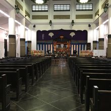 横綱公園内にある大きな建物で歴史建造物にも見えました。中にも入れ、花の展示をしておりましたが、講堂のようになっていて椅子があり前面には祭壇のようなものがあり、横にはたくさんの折鶴がありました。建物の壁沿いには東京空襲の八王子等の写真が掲載されていて悲惨さを伝えていました。