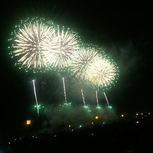 その合間にスポンサーの花火があげられる こらも音楽に合わせ目の前で大迫力が長時間続く。