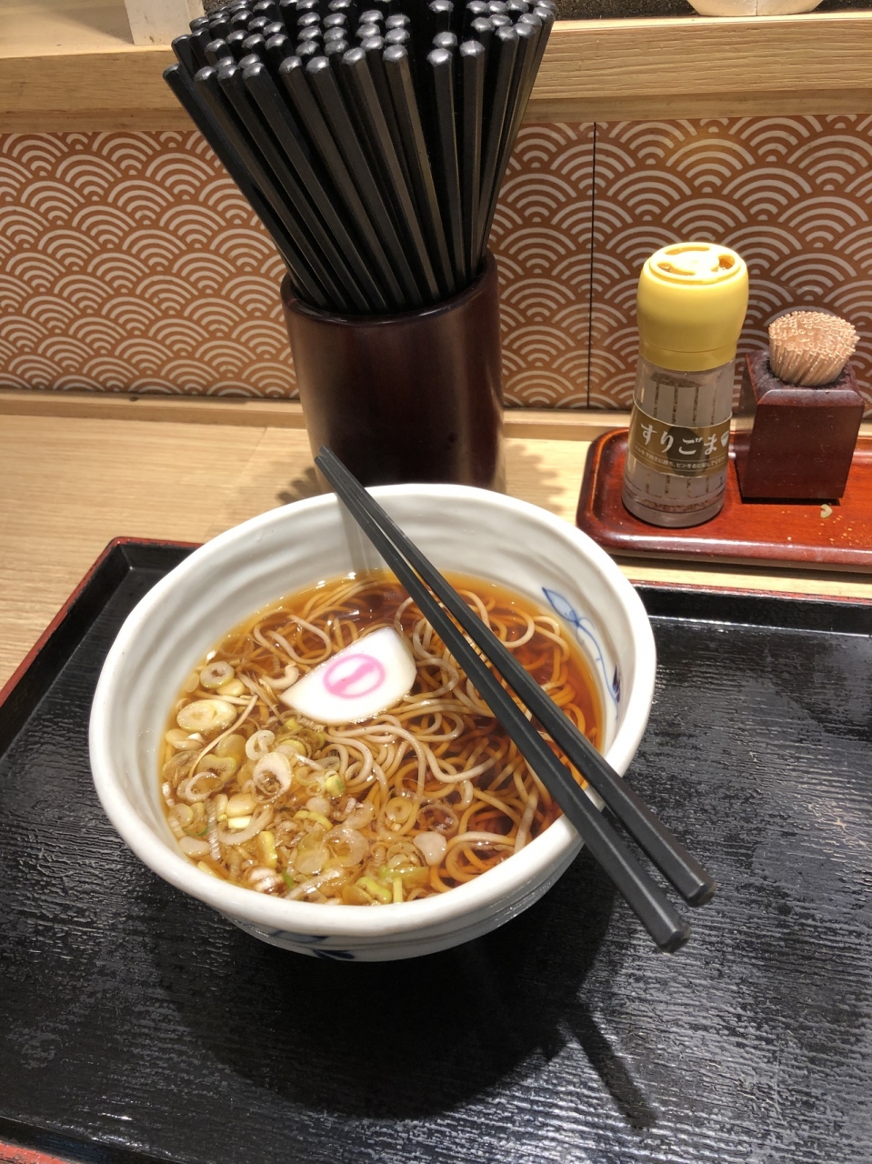 神田駅の改札内にあるおそば屋さんです。ジャンルは立ち食い系。でも店内はわりと広めだし、椅子もあるので、ゆったりめです。そして席はカウンターの他、テーブルもあるので、複数でもOK。いただいたのはシンプルにかけそばを。そば自体は普通ですが、出汁はまずまずの風味と味でした。