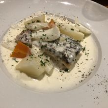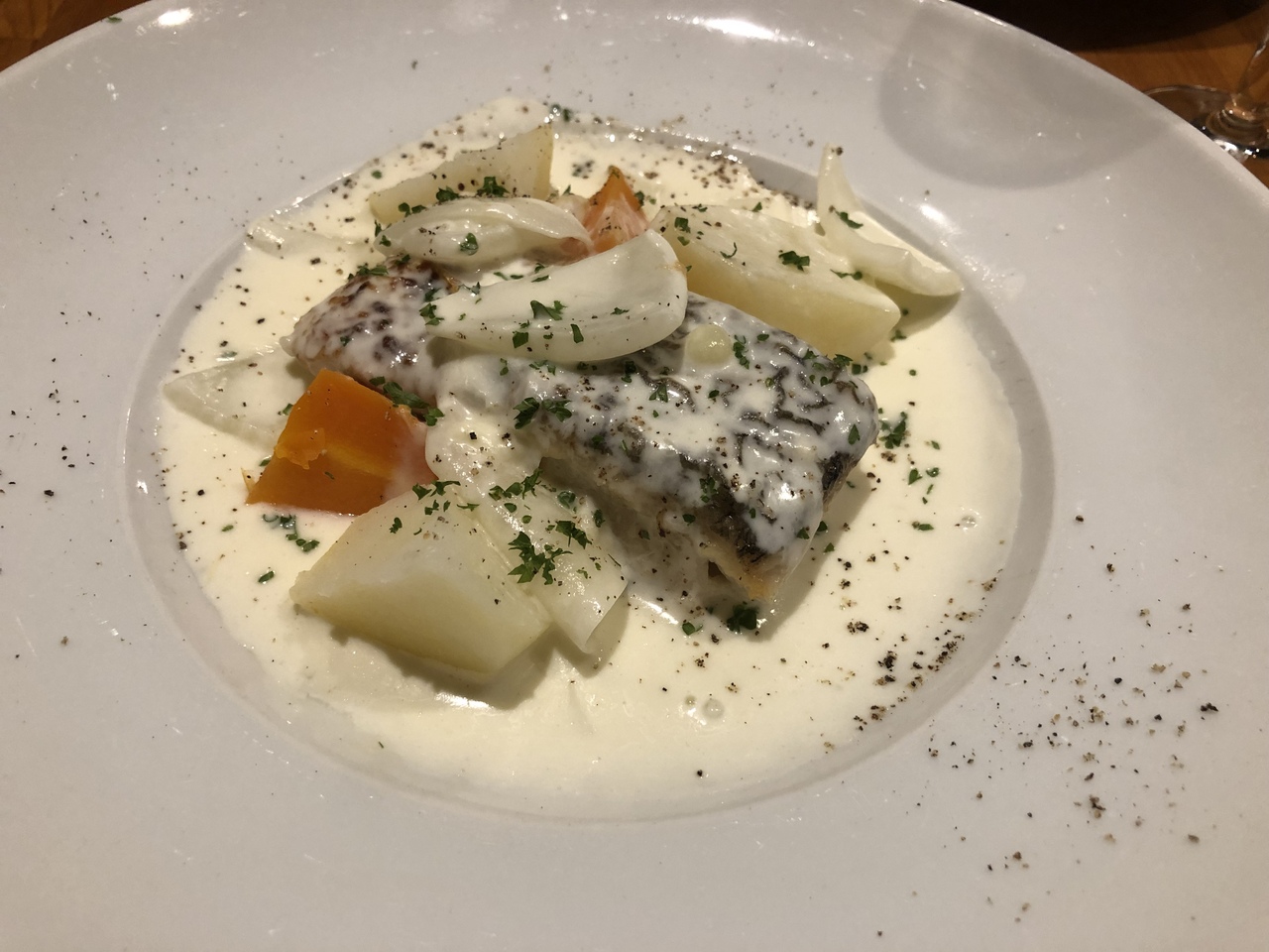 メインは白身魚のクリームソースでした。バケットにソースを付けて食べるのが絶品で、おかわりしました。