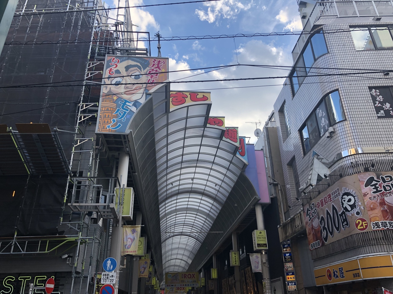 ギザギザのお洒落なアーケードの屋根に「すしや通り」と書かれており、「浅草はいつもモダン」と可愛らしい看板もあります。何故か寿司屋は少なかったです。