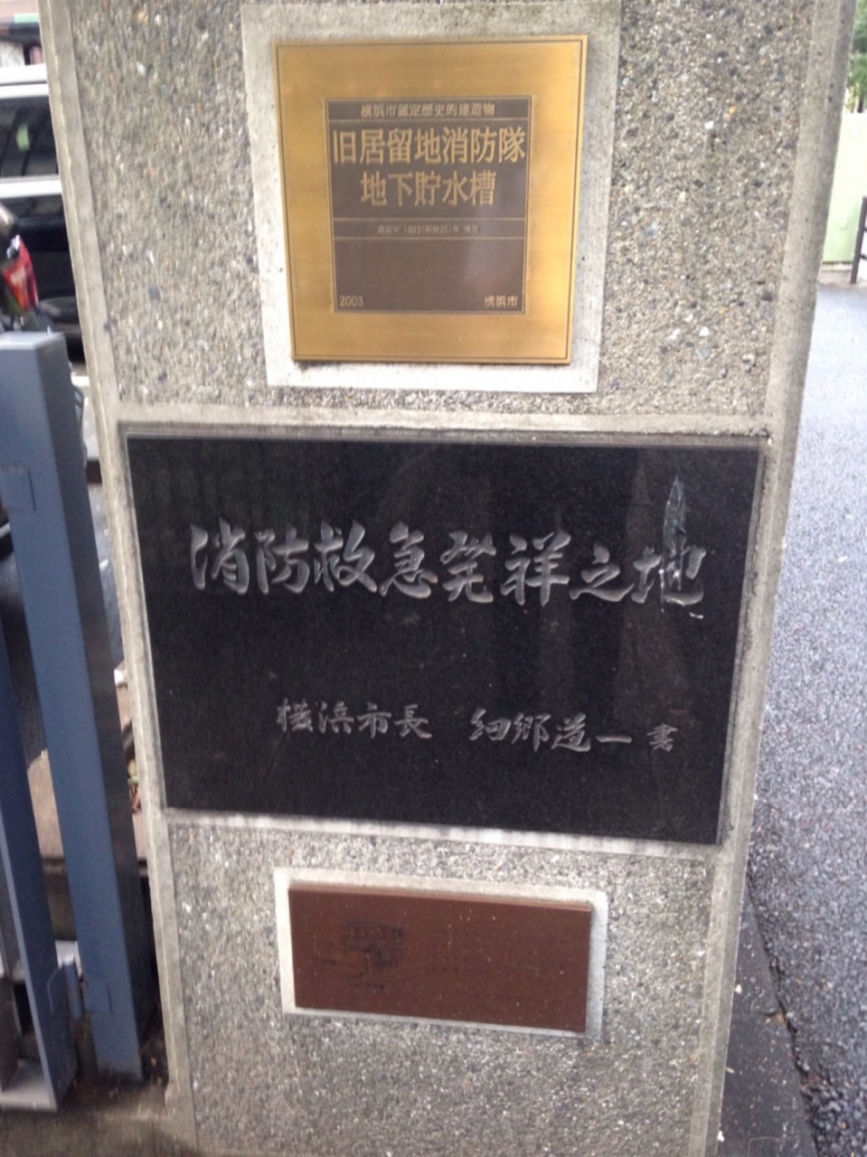 旧居留地消防隊地下貯水槽の所にプレートがありました。日本で初めて消防車と救急車が置かれた地とのことです。近隣の日本大通りの道幅が広いのは通りが隔てる外国人居留地と日本人街の間で火事が延焼しないようにとの意図もあったことなど、火事対策も開国から発展してきたのですね。