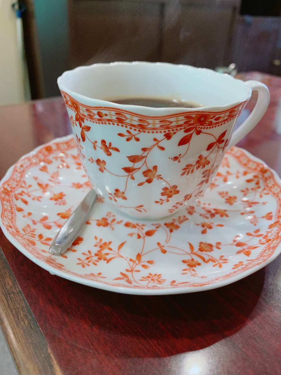 ランチ後にコーヒーに連れていってもらいました。なんかおもしろい喫茶店です。紙で社長室なんて書いててかわいくもあります。あつあつのコーヒーがでてきました。これって作り置きなのかしら。カップもかわいいし、純な喫茶店でした