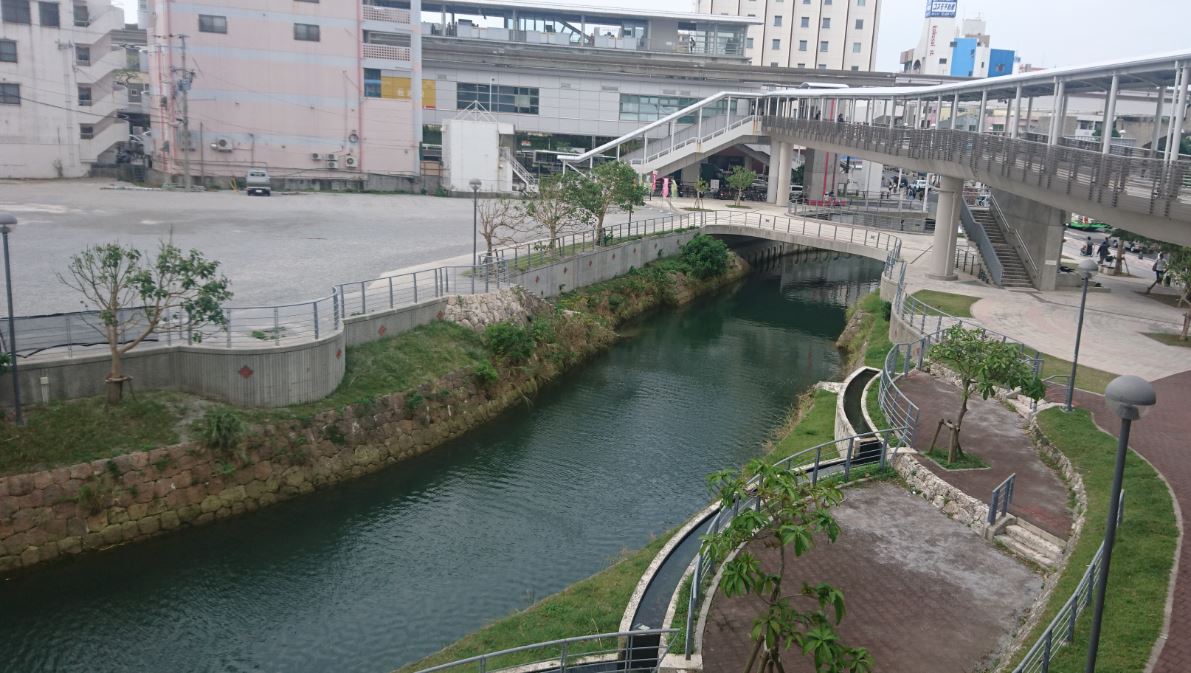 安里川親水庭園は那覇市民が憩える久茂地川沿いの整備された護岸公園です。久茂地川自体はお世辞にも清流とは言えませんが庭園自体は牧志駅前から全景が見えます。南国特有の濁ったグリーンの水面に時々海の魚も迷い込みます。