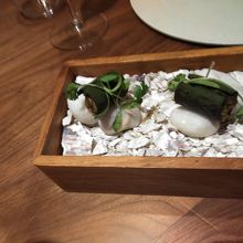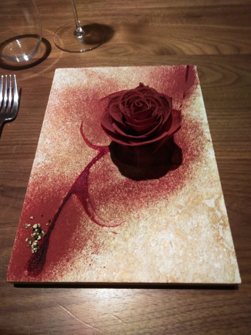 名物の赤いバラの花は、料理かデザートかどっち?って思ってましたが、料理、でした。花びらはビーツのチップです。野菜のカービングで作った花びらでなく、花びらがうすくて繊細!!これを見て食べるだけでも行く価値はあります。