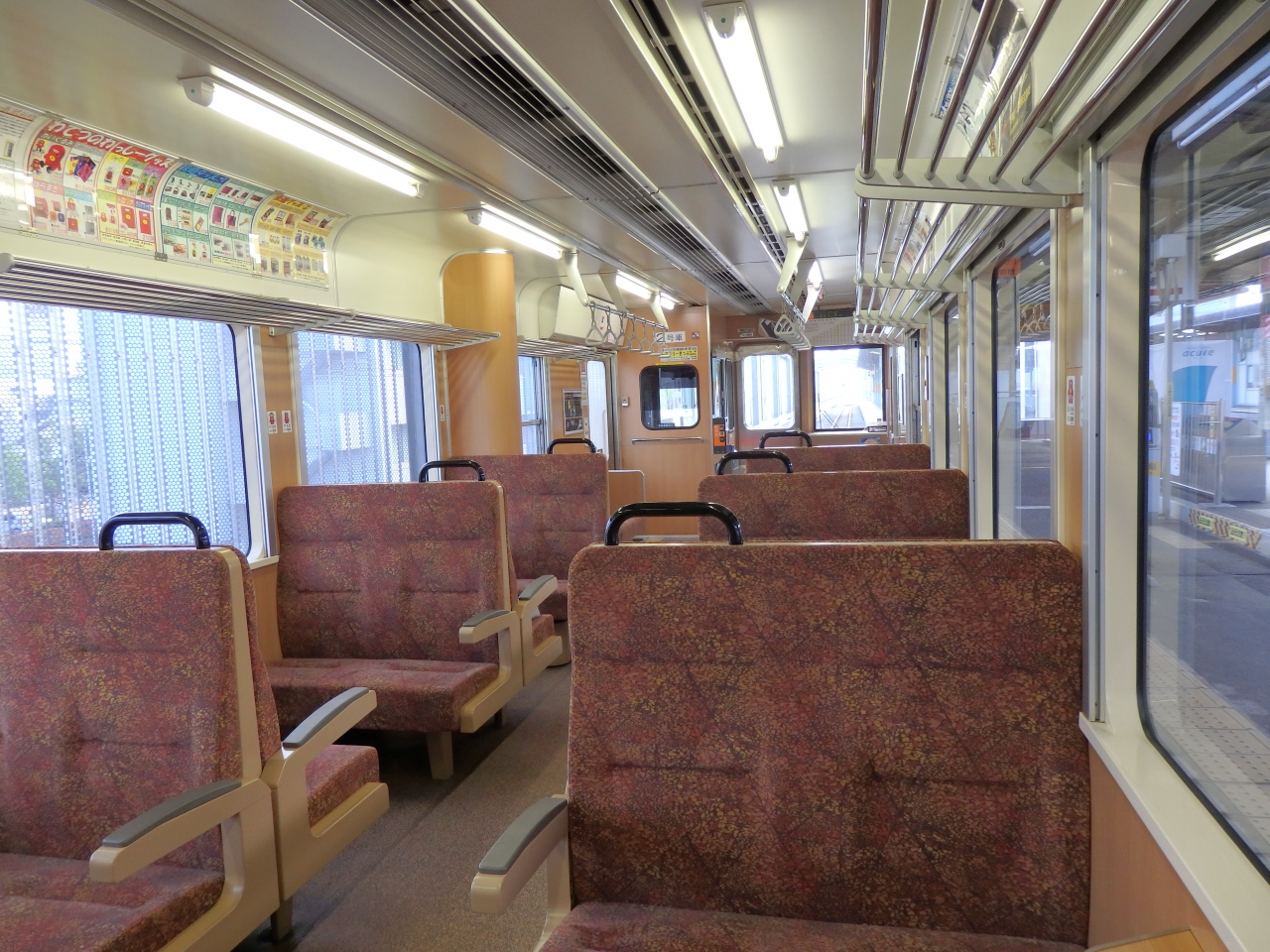 2両編成で前は窓がない車両で、後ろは普通の車両でした。