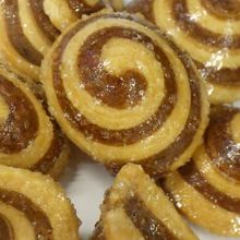 2色の生地を渦巻き状に巻いて、カットし、、1つ1つコマ(独楽)の様に成形して、油で揚げている。