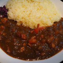 カレーは、サフランライスとは別の容器で提供されるので、食べる際に客が自らライスの上に掛けてからいただく。