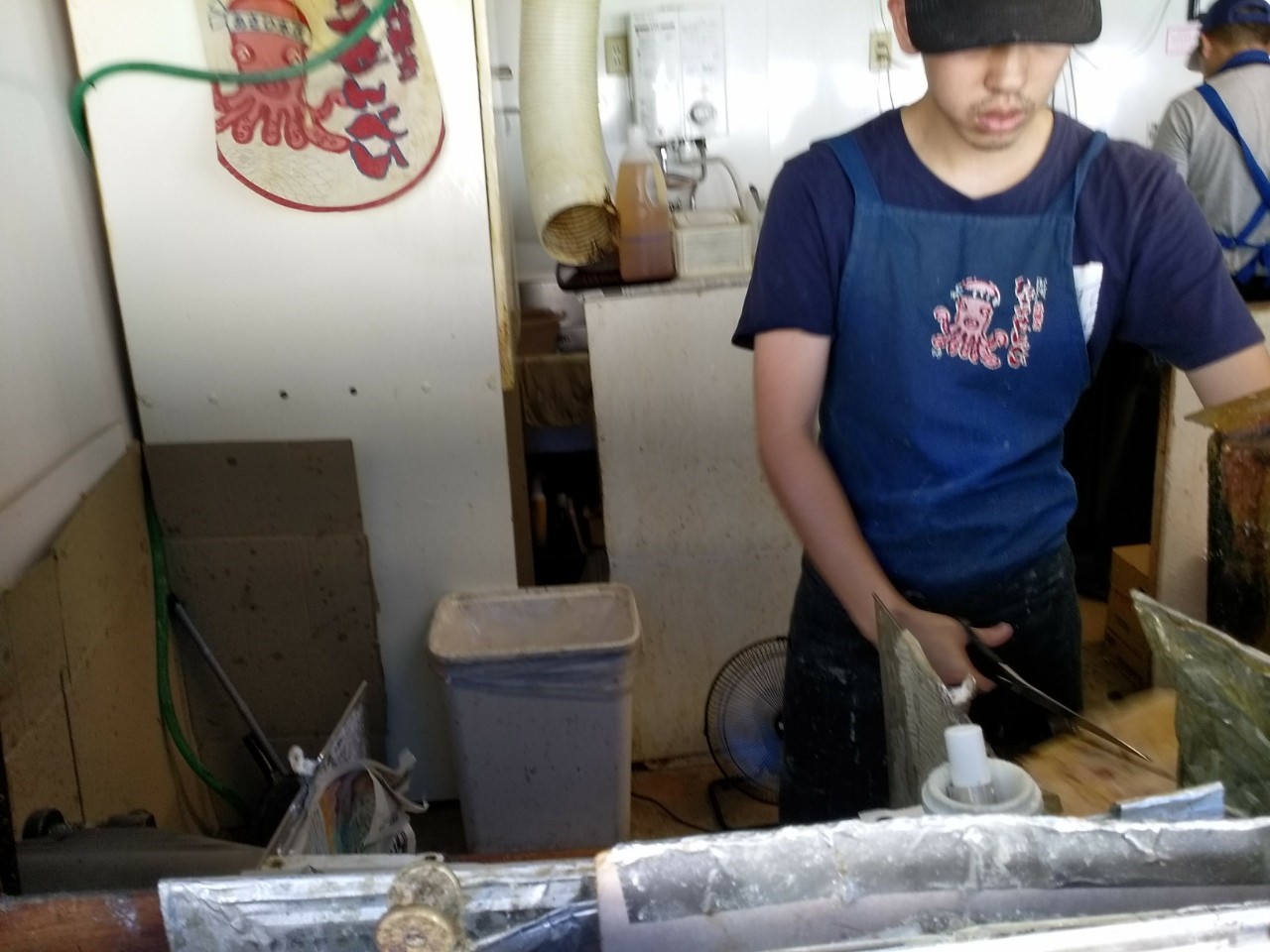 店頭では三人の職人さんが猛烈な暑さ真中をプレス機を使って作っていきます。