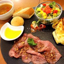 プレートには。ローストビーフ・ピザ風キッシュ・サラダ・スープ・パンがついてました。