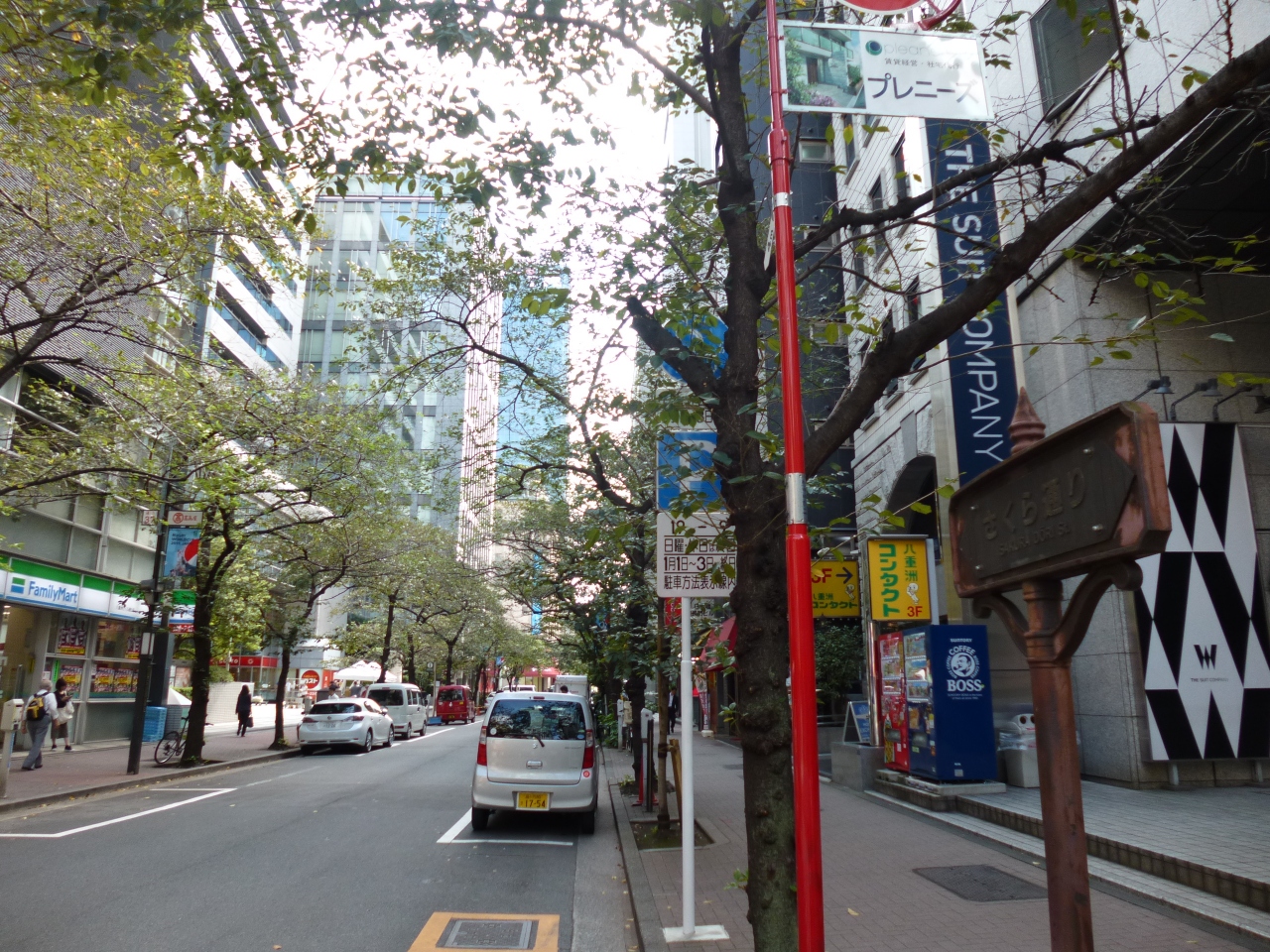 八重洲通りと並行して、東京駅方面から真東に伸びる通りです。裏通りなので、大きなビルなどはなく、建物は全体に古いです。昔から営業しているような飲食店も多く、昼食時間帯は近隣にお勤めの方の姿が多いです。9月なのでもちろん開花はしていませんが、「さくら通り」の名の通り、歩道にはたくさんの桜の木が見かけられました。