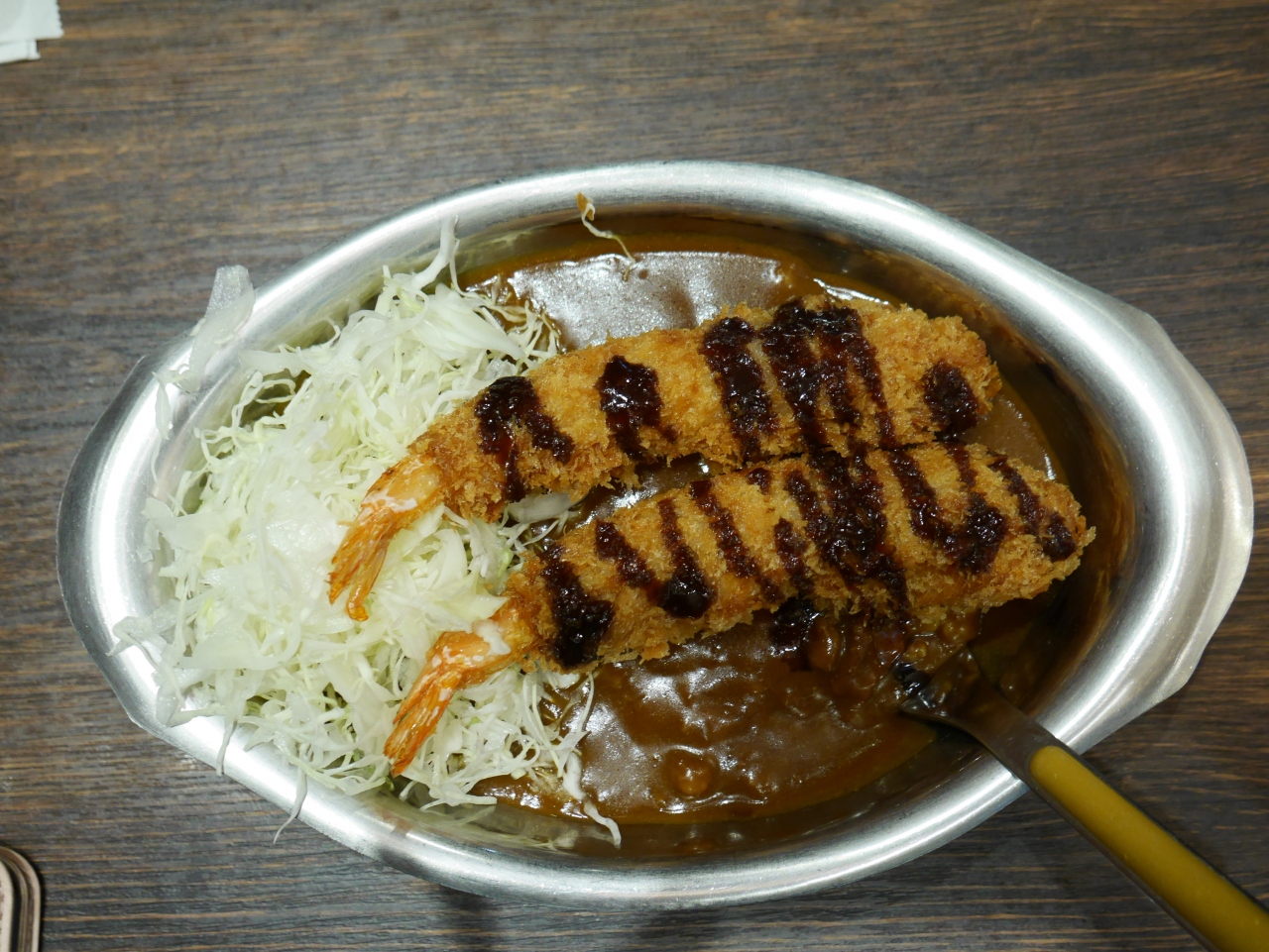 店頭の券売機で食券を購入して席へ。エビフライカレーのS(590円)にしました。