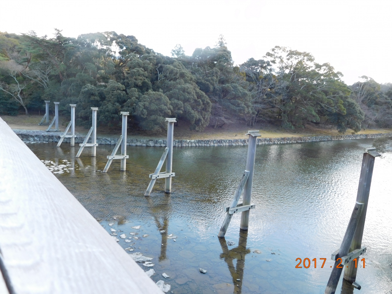宇治橋の上流に、屋根のついた不思議な木があって、なんだろう?と思い調べてみると、「木除け杭」と言い、増水して流れてくる倒木が宇治橋の橋脚を直撃しないよう止めたり、木の方向を変えたりするための杭だそうです。