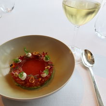 銀座一丁目駅から歩いて2,3分のZOE銀座ビルの8Fにあるレストラン ヒラマツ系列のフレンチ料理のレストランです。結婚記念日のお祝いで夫婦で訪れました。席は結婚式でも使えるような広い広間の窓側テーブル席。窓からは銀座のビルが目の前に見えます。頂いたのはメインに魚、肉料理の付いたランチコース。前菜から始まり、どの料理も手の込んだ装飾が施され食べるだけでなく、見た目も楽しめる、美味しい料理が味わえます。お値段は高めですが、記念日に使うのに良いお店です。