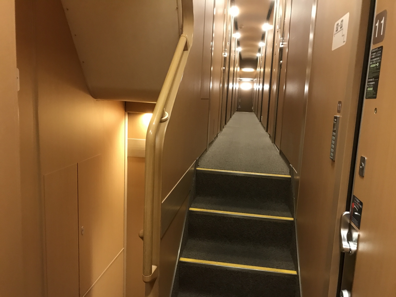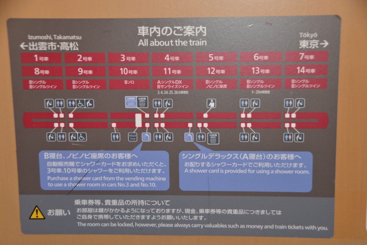 以前サンライズ出雲に乗った時は「ノビノビ座席」という普通車シートだったので、今回はA寝台かサンライズツイン、せめてデュエット・ツインに乗りたかったのですが取れず、「シングルツイン」での旅となりました。狭い!何と言ってもベッド以外の床がわずかしかなく、家内と2人分のキャリーバッグも縦に並べようとするとドアが閉まらないほどです。しかし必要は工夫を生むものです。靴の置き場所などを考えてレイアウトしていくと何とか巧く収めることが出来ました。