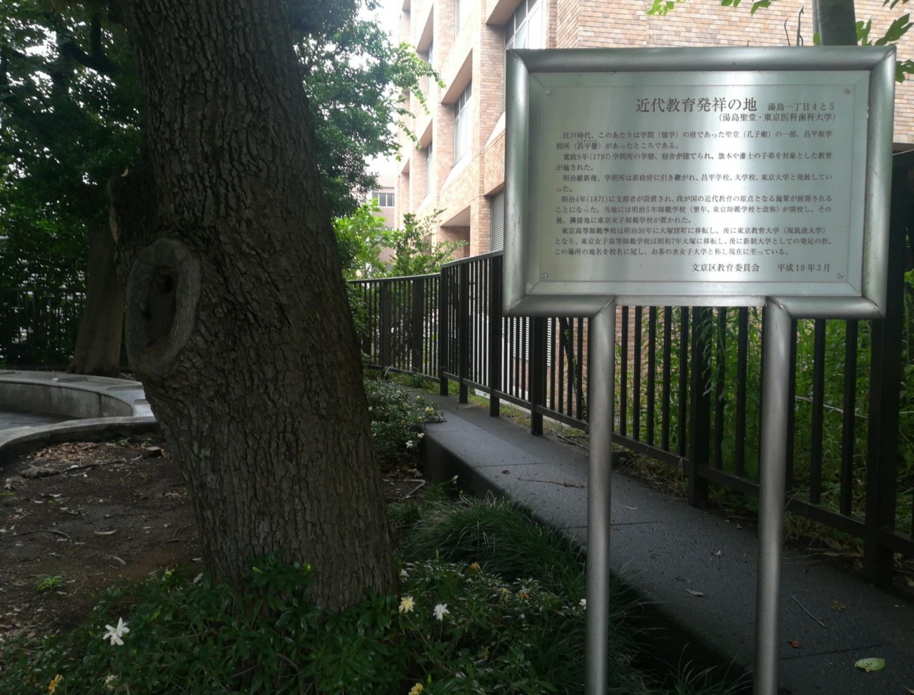 明治期以降にこのあたりで、東京大学・東京教育大学・お茶の水女子大学などが開設されたことを記念した碑(説明パネルのみ)がひっそりと建っていました。昔は、道路反対側の湯島聖堂の敷地が道路のこちら側にも広がっていたそうです。