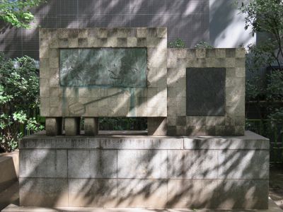 小伝馬町牢屋敷跡として知られる十思公園内にありました。すぐ近くには、吉田松陰終焉の地の石碑がありました。石碑は、市松模様になっており、洒落た印象を受けました。石碑には、歌舞伎の一場面の銅板レリーフがはめ込まれていました。御影石の碑文は白墨が入っていないため、日光の反射でほぼ何も読めませんでした。読みやすくしてほしいなと思いました。