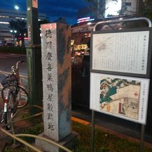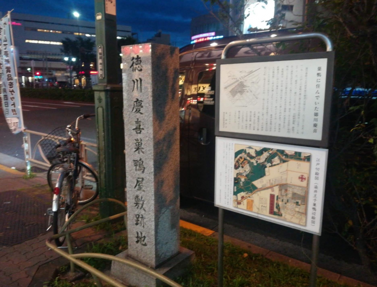 JR巣鴨駅から山手線の内側方向に中山道を少し歩いたところの歩道横に石碑と説明パネルがありました。なんでも、明治後半に徳川慶喜が4年ほどこちらに居を構えていたそうですが、いまはもちろん屋敷があった面影はありませんでした。