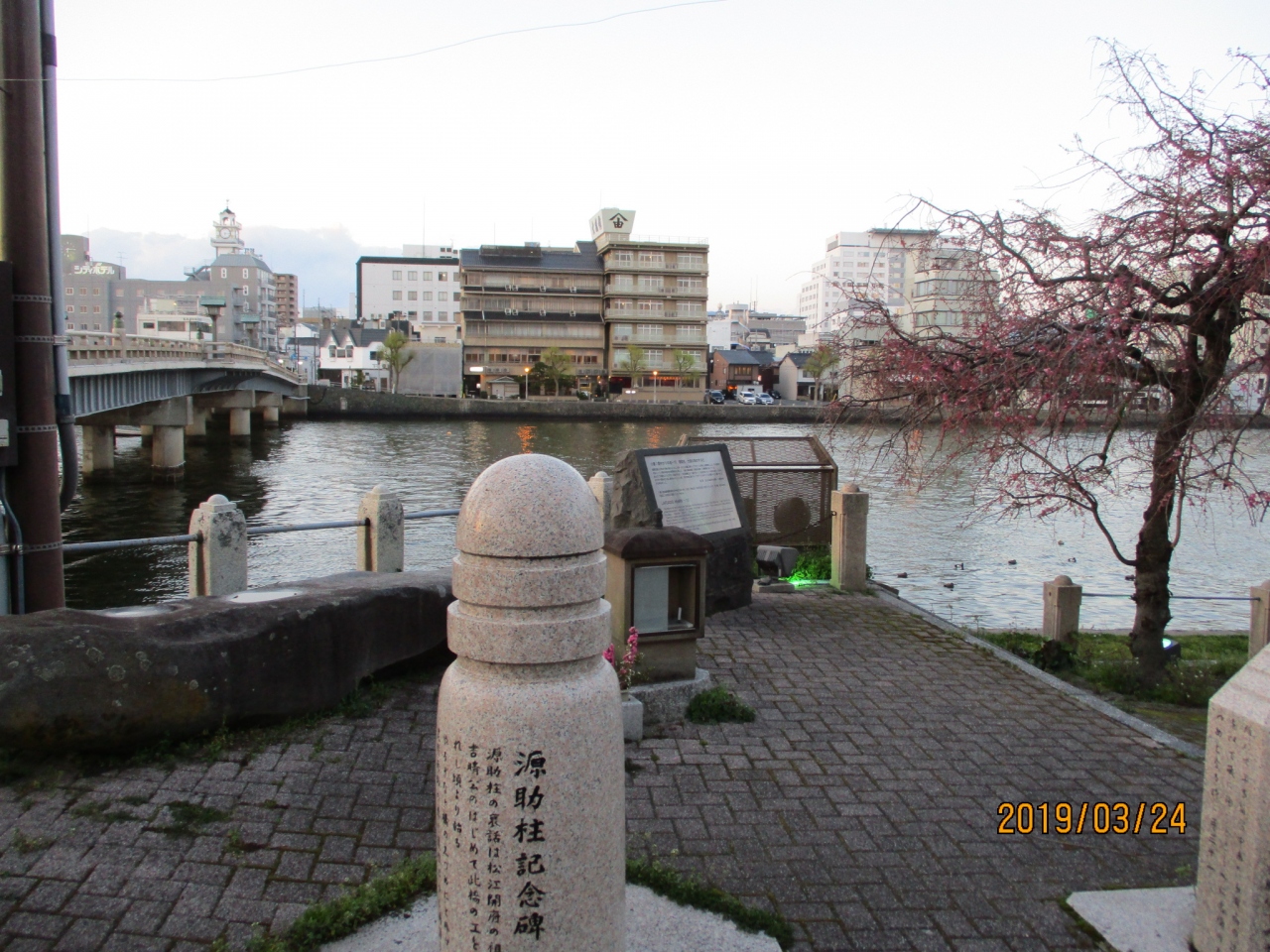 松江大橋の南、大橋川沿いにたっています。大橋川に橋を建設するとき、難工事のため、人柱をたてることにし、最初に通りかかった源助が人柱とされました。その源助を供養するためにたてられた石碑です。今では、考えることのできないような残酷な話しです。