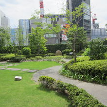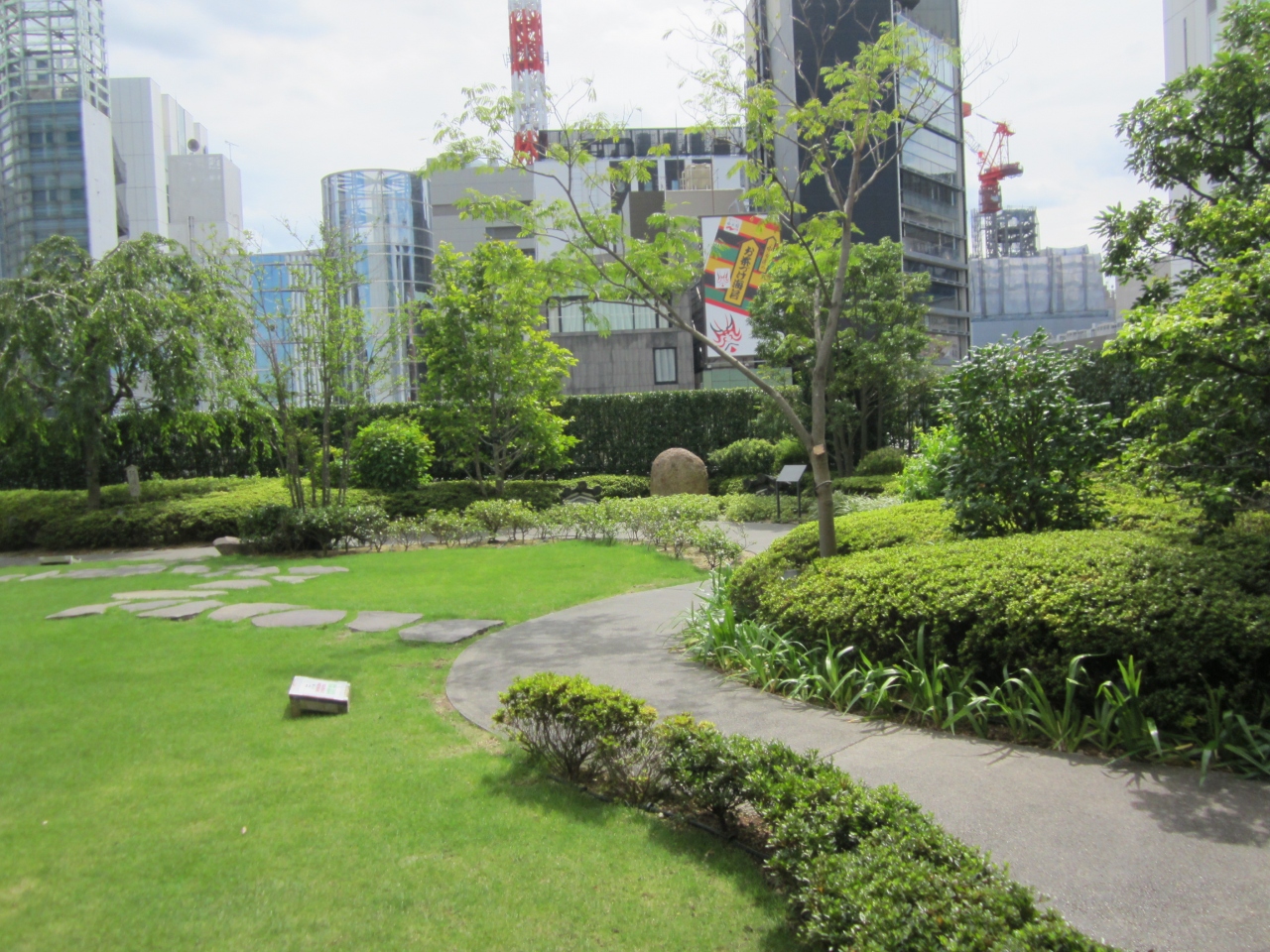 人が多く緑の少ない都会で、こちらの緑のお庭でほっと一息できました。あいにく暑い日で陰でも椅子に長くは座っていられませんでしたが、季節の良い時なら長居をしてしまいそうです。赤い五右衛門階段を下りると四階回廊へ行くことができます。