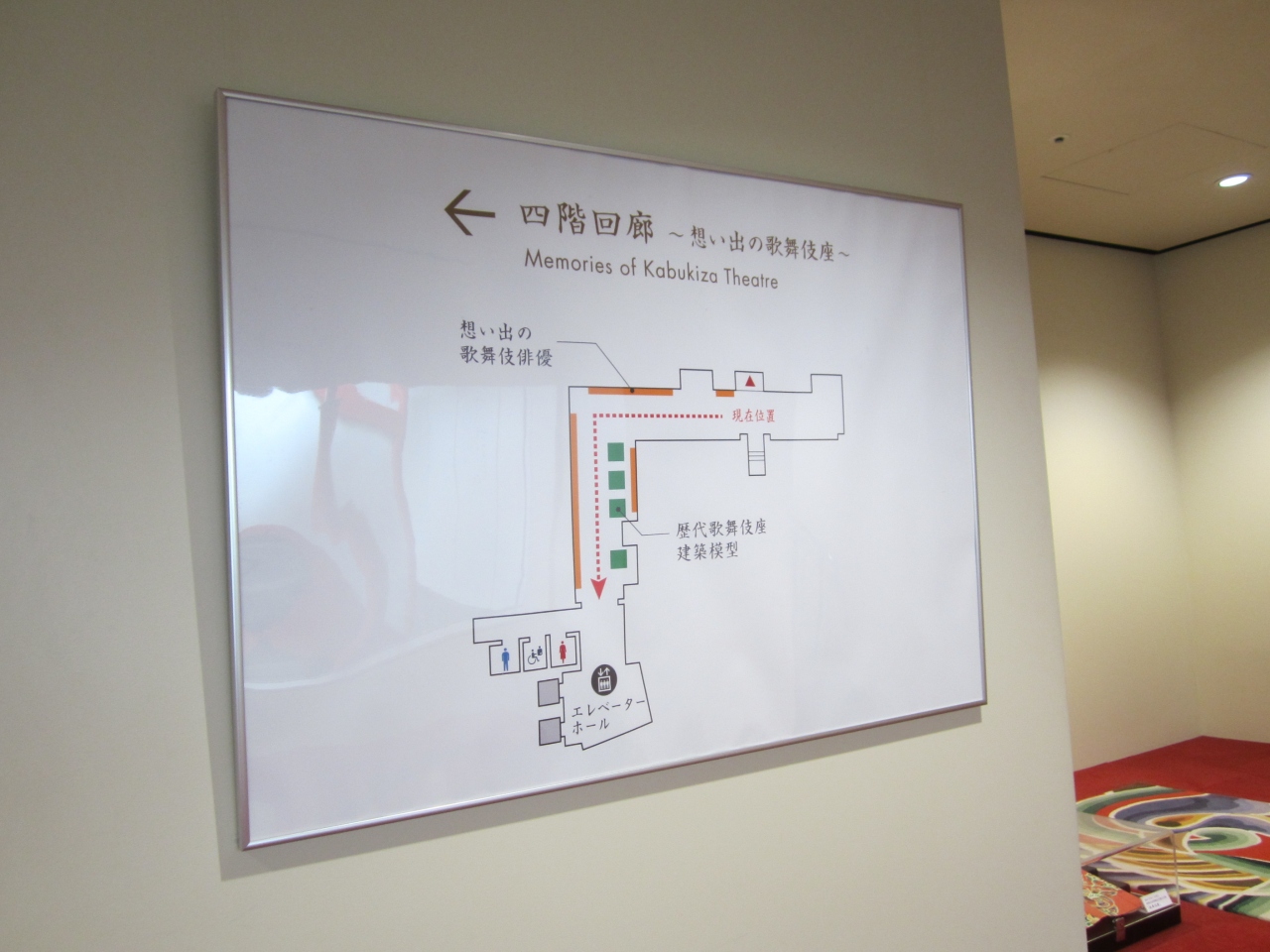 屋上庭園から赤い五右衛門階段を降りるとありました。歌舞伎に精通していませんが、テレビで顔見知りの役者さんを見て懐かしんでいました。回廊の奥にはお手洗いもありエレベーターもありますので、すいているお手洗いを利用したついでに見られるのもいいかもしれません。