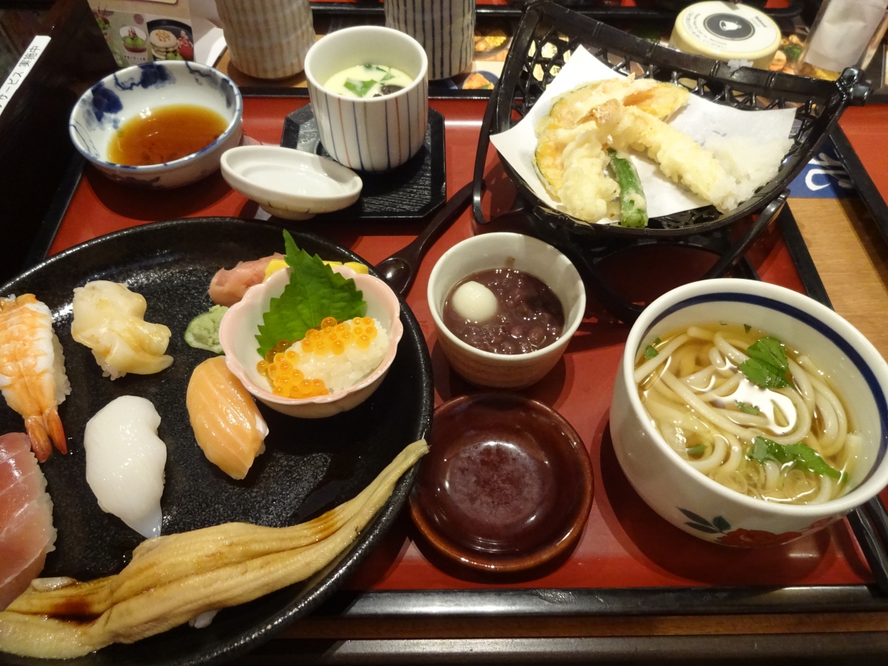 穴子の1本寿司が入った寿司とうどん、茶碗蒸し、天ぷら、デザートが付いて1609円。