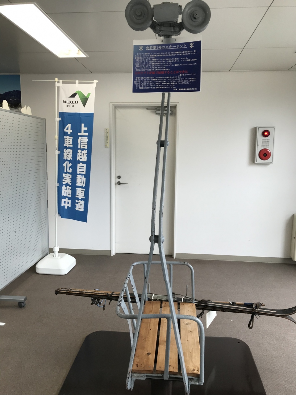 二階に日本最古のスキーリフトの展示があり座ってみることができました。