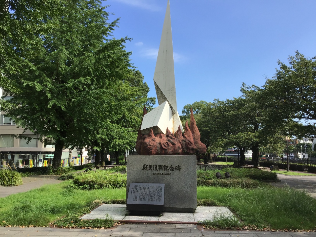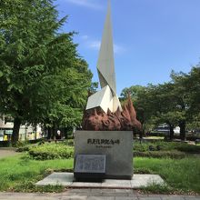 鹿児島中央駅から歩いて行ける場所にある、歴史ロード維新ふるさとの道の中にあります。近くには維新ふるさと館があります。先が尖った形をしているのが特徴で、太平洋戦争で破壊された街の復興を記念して作られた記念誌ですを記念して作られた記念誌です。