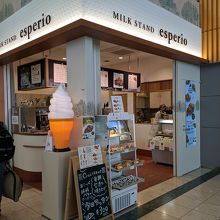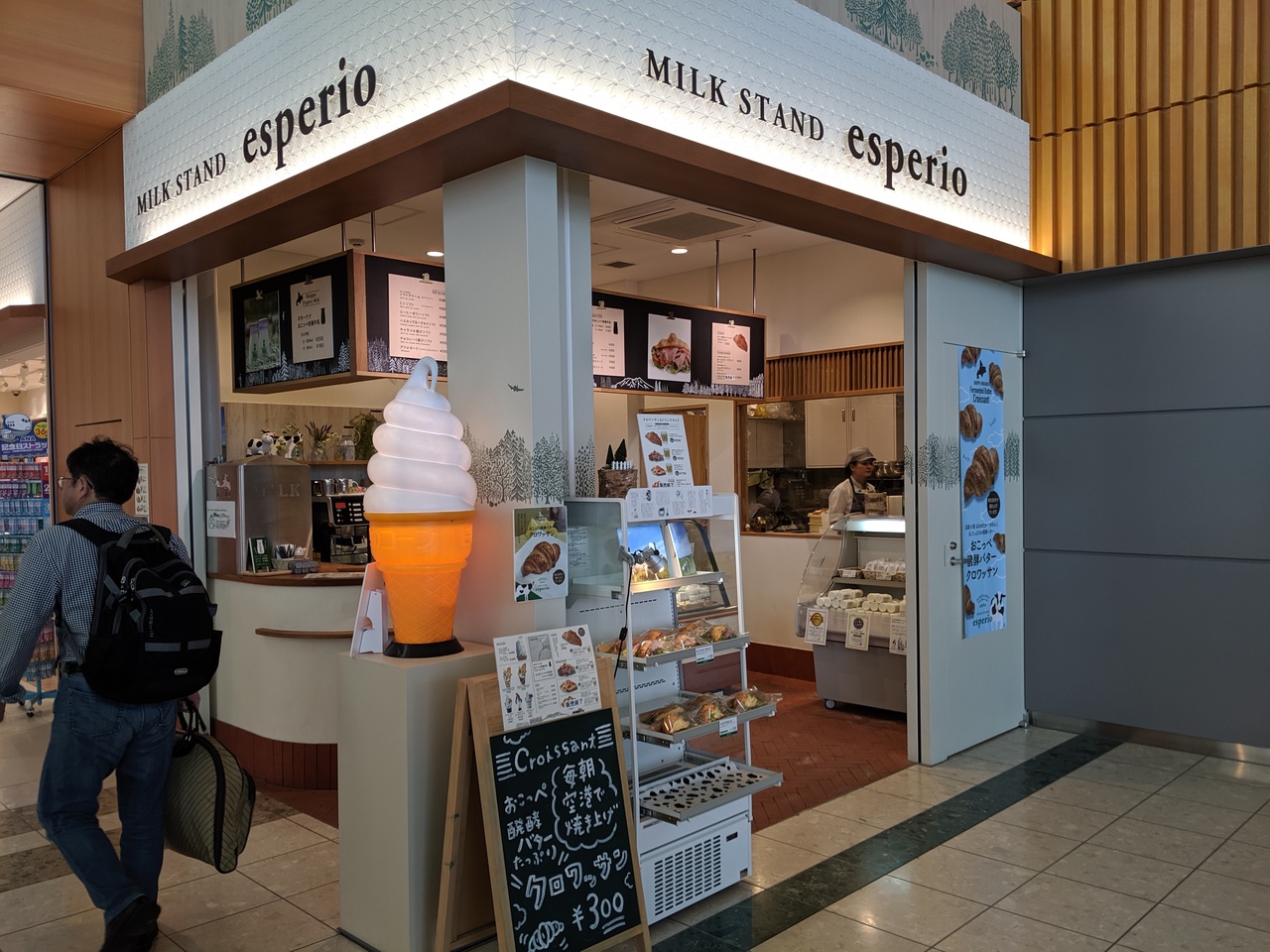 旭川空港2階、手荷物検査口の横にある小さなミルクスタンドです。定番のソフトクリームの他、牛乳や飲むヨーグルト、新鮮バターの風味を感じられるクロワッサンサンドイッチもあります。登場前に小腹を満たすのに最適でした。