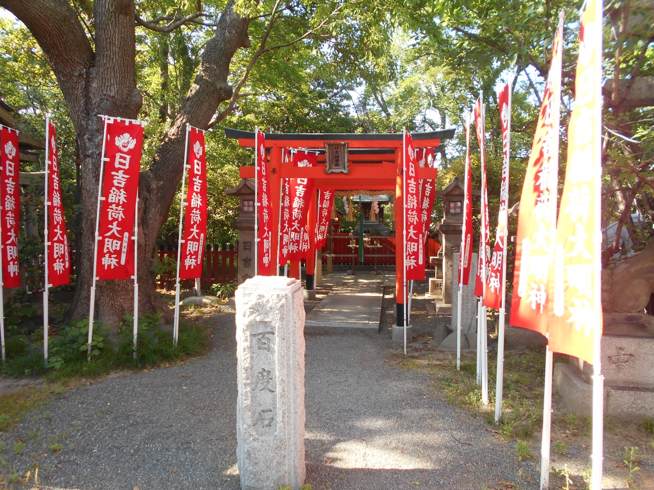 天王寺七坂の愛染坂沿いに鎮座する四天王寺七宮の大江神社境内拝殿左側に鎮座する境内末社。楠木や榎の大木が生い茂る境内で百度石を前に置き赤色の日吉稲荷大明神の旗がはためいて朱塗りの鳥居が連なる境内末社となっています。木々の緑に朱色が目立ちます。