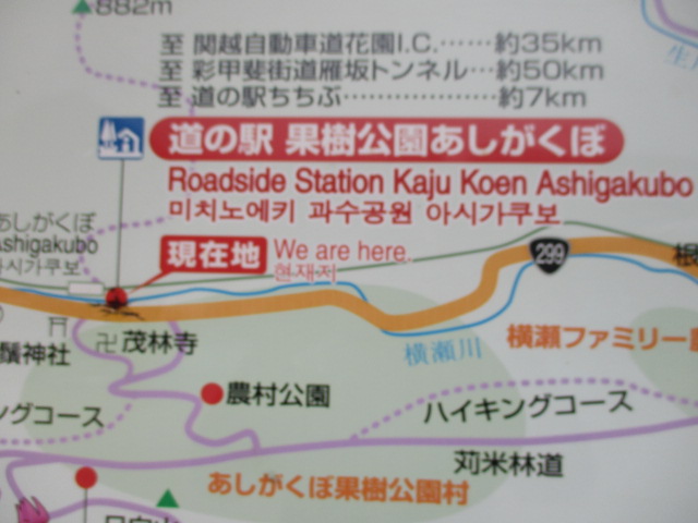 埼玉飯能から国道299号線で秩父に向かう通り沿いに道の駅 果樹公園 あしがくぼがあります。山岳S字ドライブの疲れを癒してくれる休憩所、地元で取れる果物(林檎、葡萄、梨)や野菜(トマト、胡瓜)が新鮮で充実しています。りんご、トマト買いとても美味しく頂きました。秩父のお蕎麦、味噌。こんにゃく、漬物もお土産に、たらし焼き、味噌ポテトが香り良く美味しいのでお勧めします。