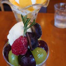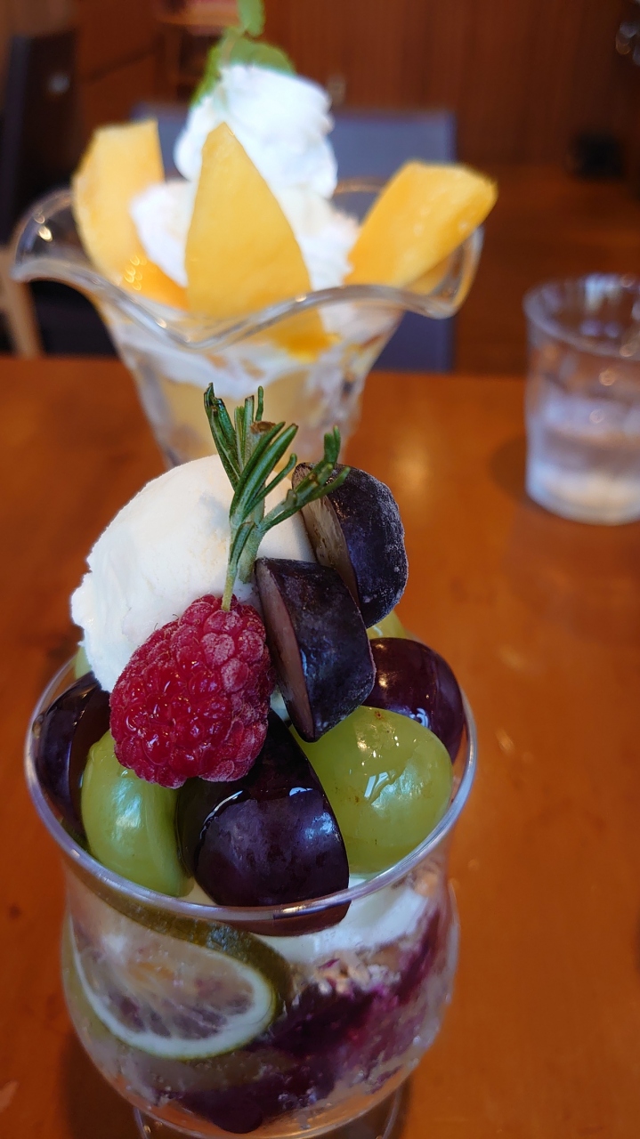 スイーツをいただきに行きました。見慣れないぶどうのパフェがあったので初めて注文してみました。甘すぎなものが苦手ですが、それでもぶどうのパフェは全体的にだいぶ甘さ控えめでした。ゼリーやヨーグルトシャーベット、ミューズリーなどで構成され、ヘルシーです。