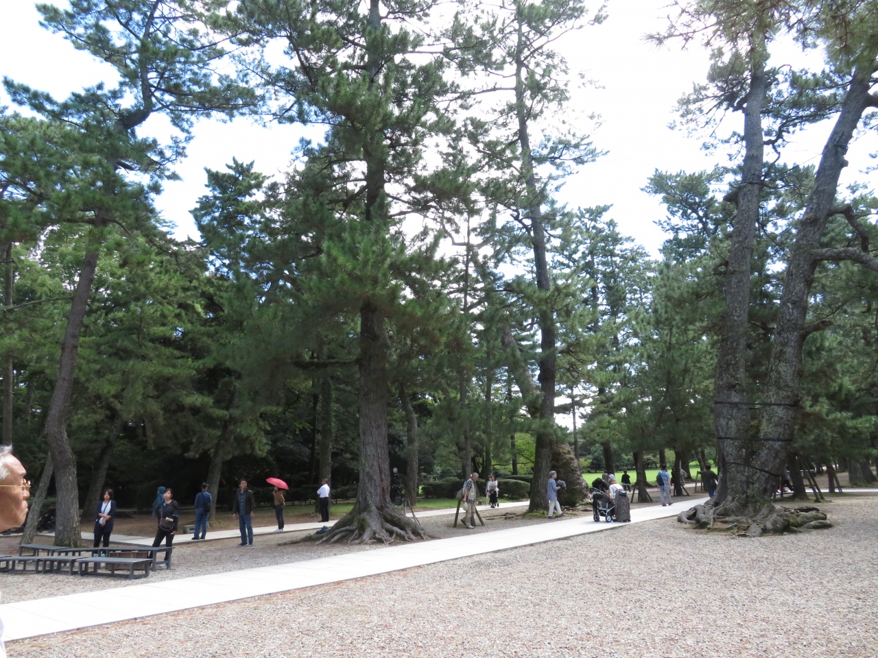 現在は松の根の保護のために中央は通行できないので、端を歩くそうです。