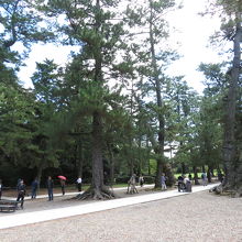 鳥居をくぐると続く松並木、これは日本の名松100選に選ばれていて、参道は中央と両側の三つに分けられ、中央は神様の通り道ということで、昔は神職や皇族の方以外は通行できませんでした。