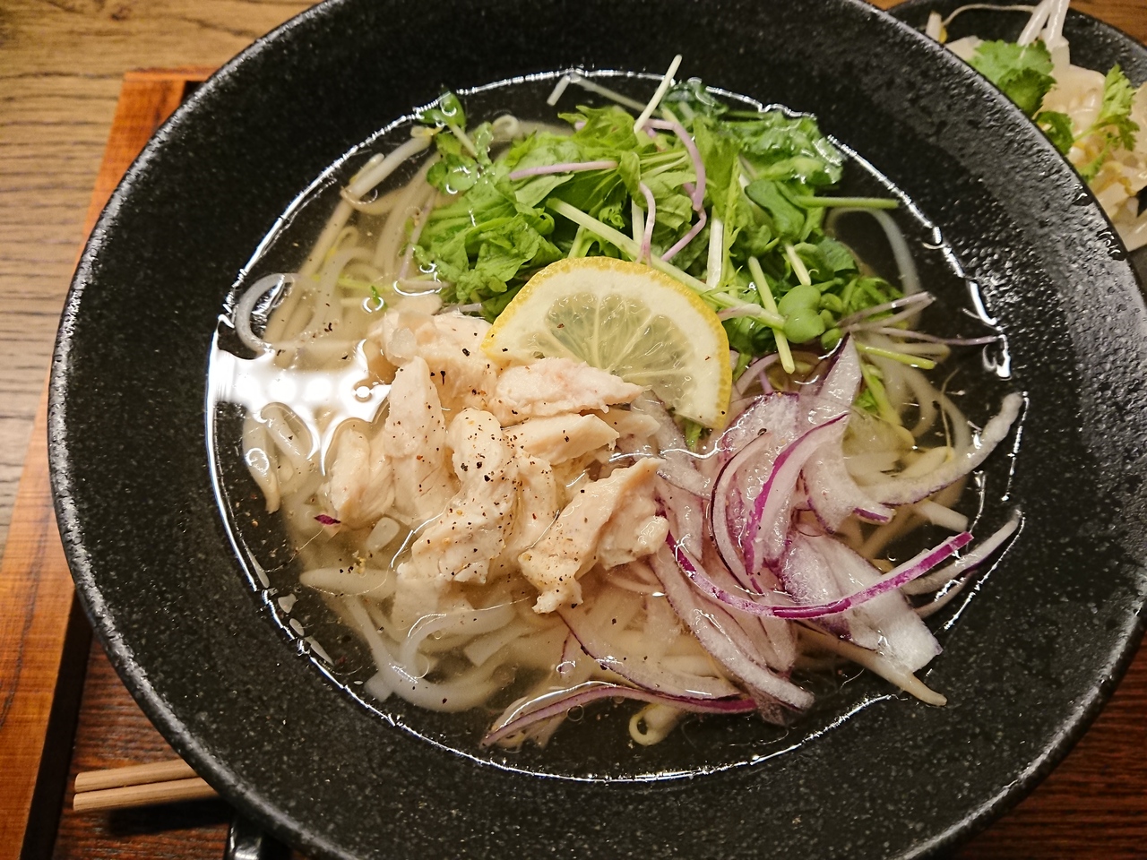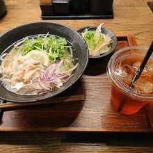 テーブル席とカウンター席があり、テーブル席ではつまみと一緒に飲んだりする事もできるみたいですが、お手軽なフォーと飲み物のセットもありました。