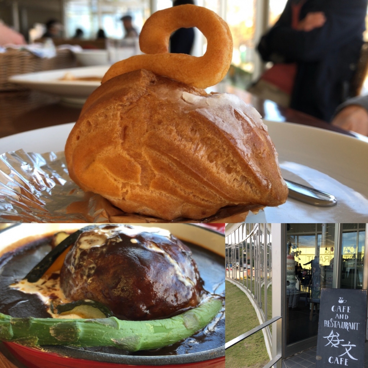 水戸駅エリアに行った際に、ちょっと近くにある水戸の”千波湖”を散策することになりました。そして、三角の途中にて、ランチを取ることになり、訪れたお店がここ「好文カフェcafé」。このお店は、千波湖の湖畔の脇にあるお店で、ガラス張りで明るい、おしゃれな感じのお店です。景観も、季節柄、心地よい秋空の下、ガラス越しに千波湖、白鳥??などを眺めながら、デミグラスソースのハンバーグをいただきました。その後は、お口直しに、名物である”白鳥シュークリーム”なぞを!見た目も白鳥っぽいものに、にんまりしながらいただきました。紅葉も素敵な色合いを見せて、まったりできたひと時でした。