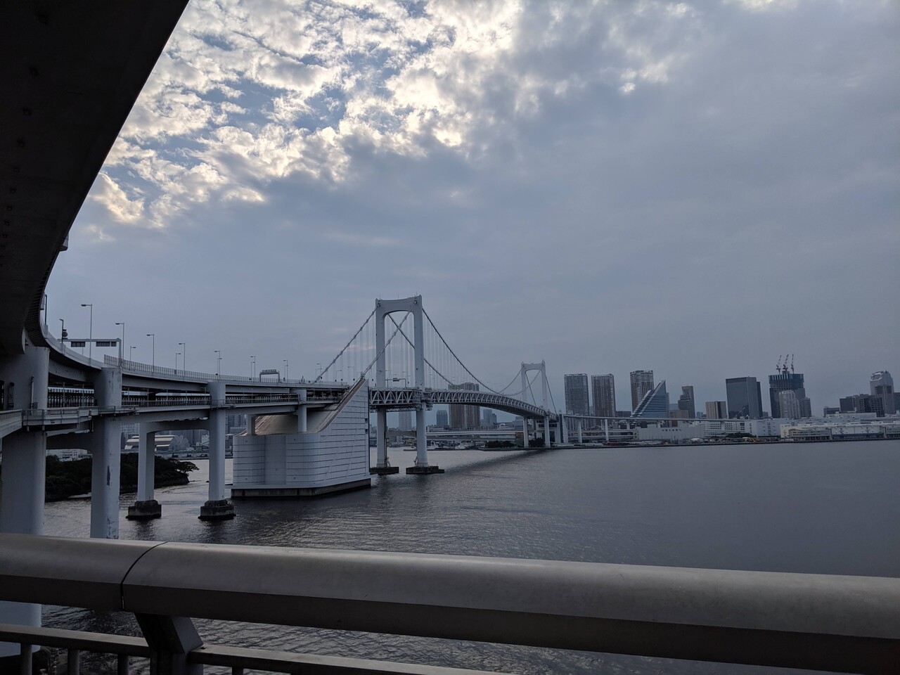 お台場と芝浦ふ頭を結ぶレインボーブリッジは、ゆりかもめや自動車で渡るのが一般的ですが、遊歩道を利用すれば、歩いて渡ることができます(無料)。お台場から芝浦ふ頭まで約30分かかりましたが、ゆりかもめや自動車の車窓から見る景色とは異なる景色を眺めながら歩けるのでお勧めです。