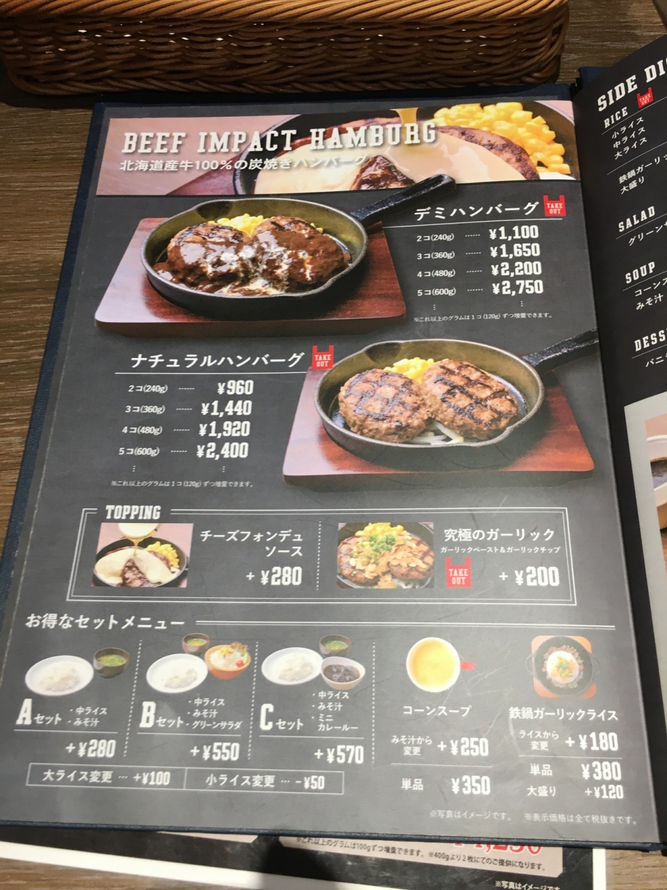 店内が広く、窓も大きいので開放的な店内でした。カウンターに座るとスマートフォン用等の電源コンセントがありました。席の前は窓なので外を見ながら食べました。デミハンバーグ2個入り240gを注文。鉄板ででてきてアツアツのまま食べれました。鉄板にはハンバーグの他にコーンがあるのみで味噌汁、ごはん付きのセットにしました。ハンバーグのデミソースがハンバーグの味を引き立てていました。