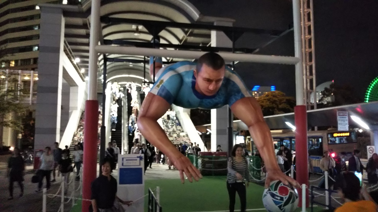 ラグビーワールドカップ2019開催にともないみなとみらい21ではパブリックビューイングを行っていました。やはり盛り上がるのは日本戦だと思います。アイルランドに勝利したときはお祭り騒ぎでした。桜木町駅を下車して入口のところにインパクトのある巨大なラガーマンがいて、記念撮影をしていました。