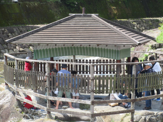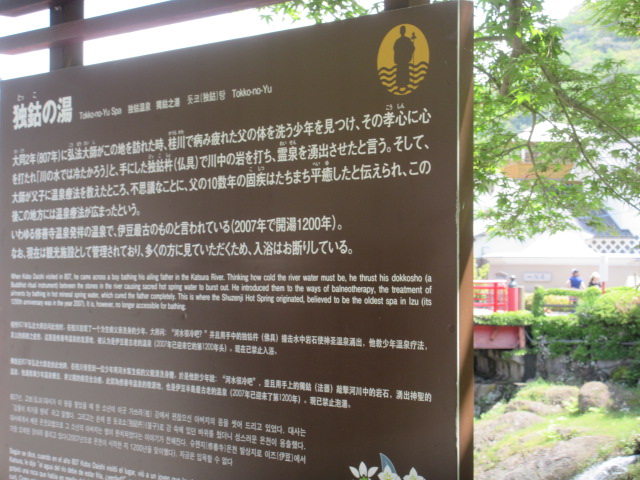 伊豆の修善寺に行きました。修善寺といったらここというくらい有名な場所で、修善寺温泉の発祥の湯だそうです。桂川の中央に飛び出す感じである足湯で、空海が見つけたそうです。無料で入れますが、基本的には見学スポットになっていて、足湯は公園の方を使う感じが正解みたいだけど、結構人が集まっていました。