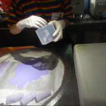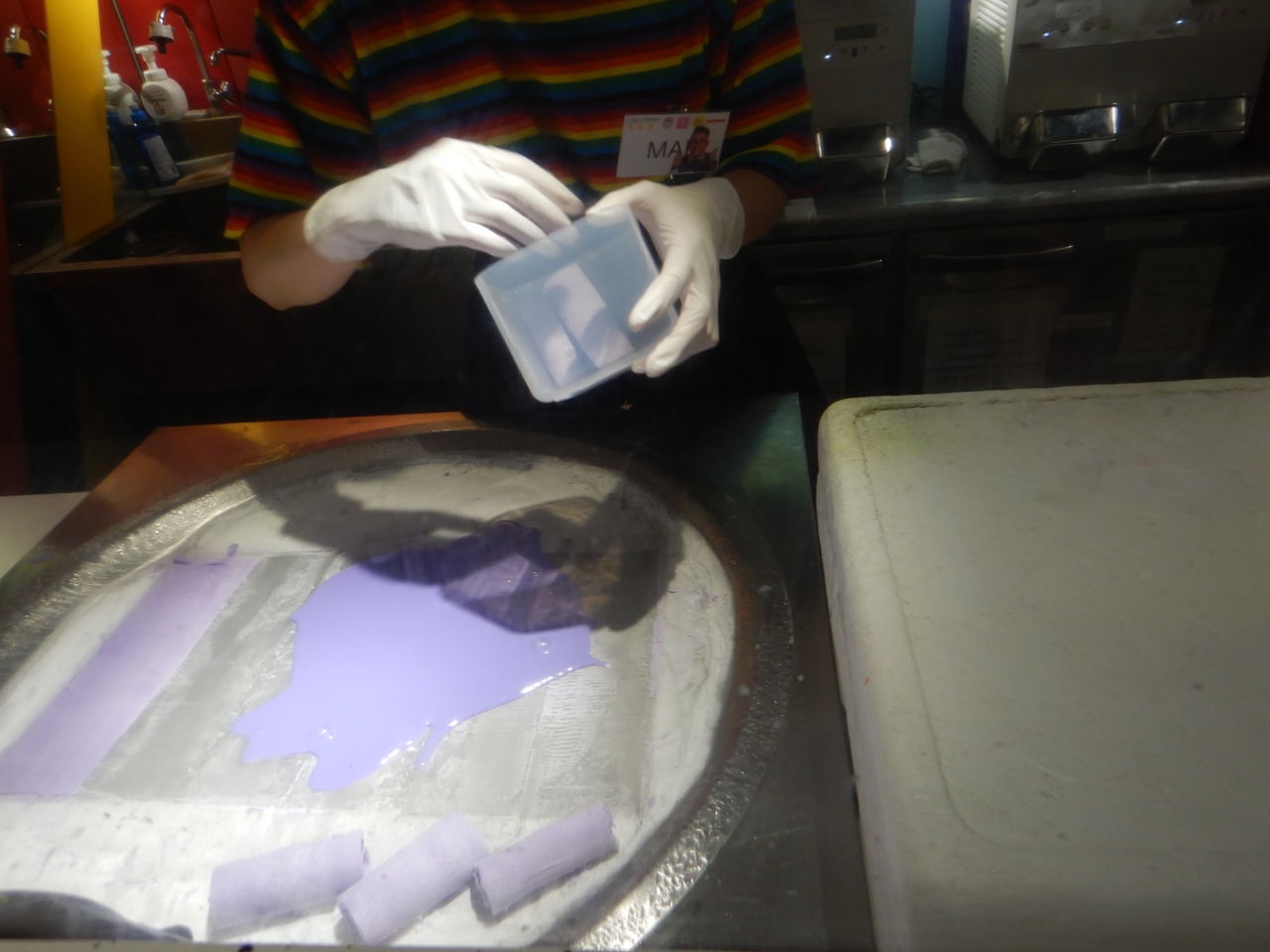カラフルな綿菓子のショップでテレビで何回も見たことのあるお店です。私が色付きの食べ物が好きではなく、のぞいただけでしたが、とても大きくきれいな綿菓子が出来ていました。2階は綿菓子ショップ、1階はロールアイスのショップでした。