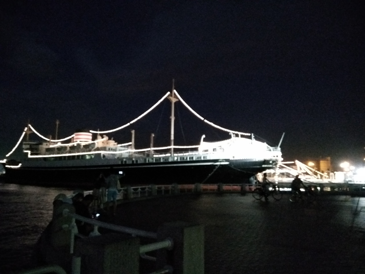 昼間見たときは、立派な船だなー、と思いましたが、夜も迫力あってキレイでした。暗くなると、そんなに足を止めて見ている人もいなかったので、写真も撮りやすかったです。近くにベンチもあるので、ぼーっと海と船を眺めるのもいいですね。