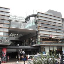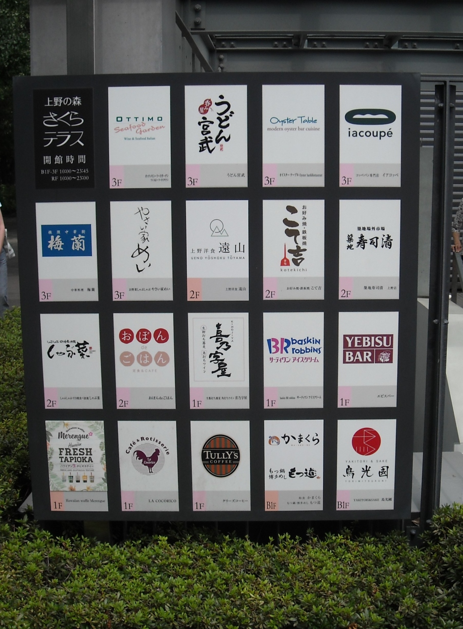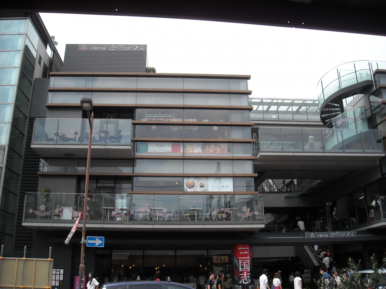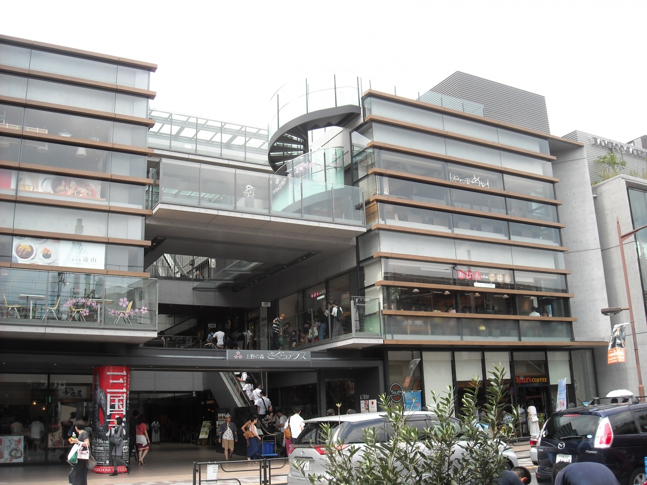 清水寺のような懸造り? ガラスと鉄で作られた4階建ての食堂ビルディングです。どの店舗満員でした。エレベーターと中央に上り専用のエスカレーターがあり、屋上にあたるところは西郷隆盛の銅像広場です。上野駅より道路一本便利です。